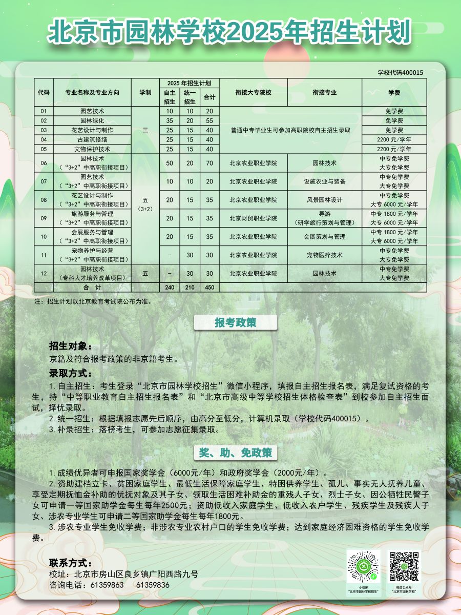 1.自主招生:考生登录“北京市园林学校招生”微信小程序,填报自主招生报名表,满足复试资格的考生,持“中等职业教育自主招生报名表”和“北京市高级中等学校招生体格检查表”到校参加自主招生面试,择优录取。