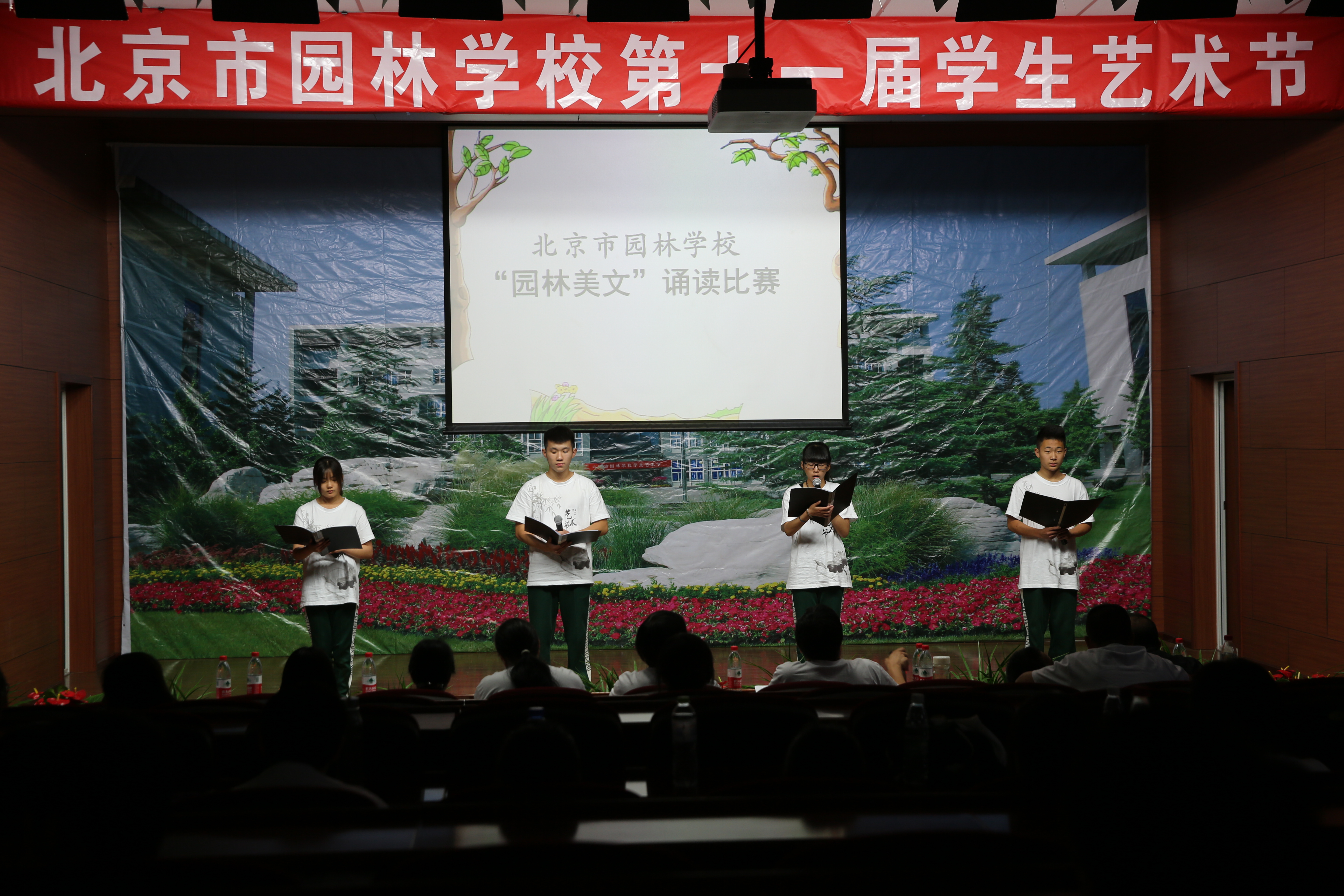 作为艺术节的重要活动之一----经典诵读比赛,在开幕式结束后登场。全体学生以班级为单位参赛,朗诵篇目包括必选篇目《老师,我爱你》,以及从《北京市园林学校美文诵读选本》中任选一篇“园林美文”,评选从遵守纪律、声音洪亮、精神饱满、普通话标准、表现形式等方面现场打分。同学们一篇篇经典美文,一句句哲理结晶,不仅让听众享受到阅读的快乐,弘扬了尊师重教的中华民族优良传统,更让大家悟出了道理。