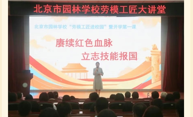 为深入学习贯彻党的二十大和二十届二中、三中全会精神,落实立德树人根本任务,加强职业学校学生思想政治教育,弘扬劳模精神劳动精神工匠精神,为学生讲好“匠人匠心”的行业故事“大思政课”,9月12日,园林学校举行“劳模工匠进校园”暨开学第一课活动,邀请颐和园园艺古树中心正高级工程师王爽、天坛公园宣教中心主任王玲、香山公园文化队双清别墅班班长姜楠作为“劳模工匠大讲堂”主讲人开展主题宣讲。学校领导班子成员、教师代表及全体学生聆听宣讲。