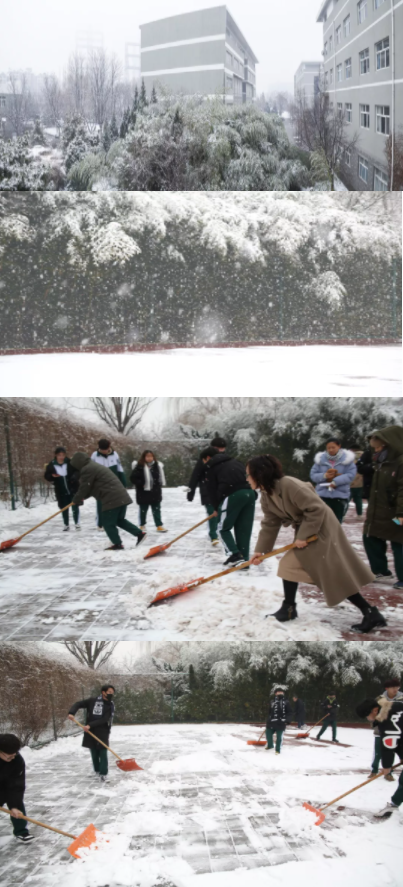 校园雪景美不胜收,师生不畏严寒,铲冰扫雪,忙碌的身影为这份美丽注入了温暖的力量,用实际行动践行“修德强技,树木树人”的校训。