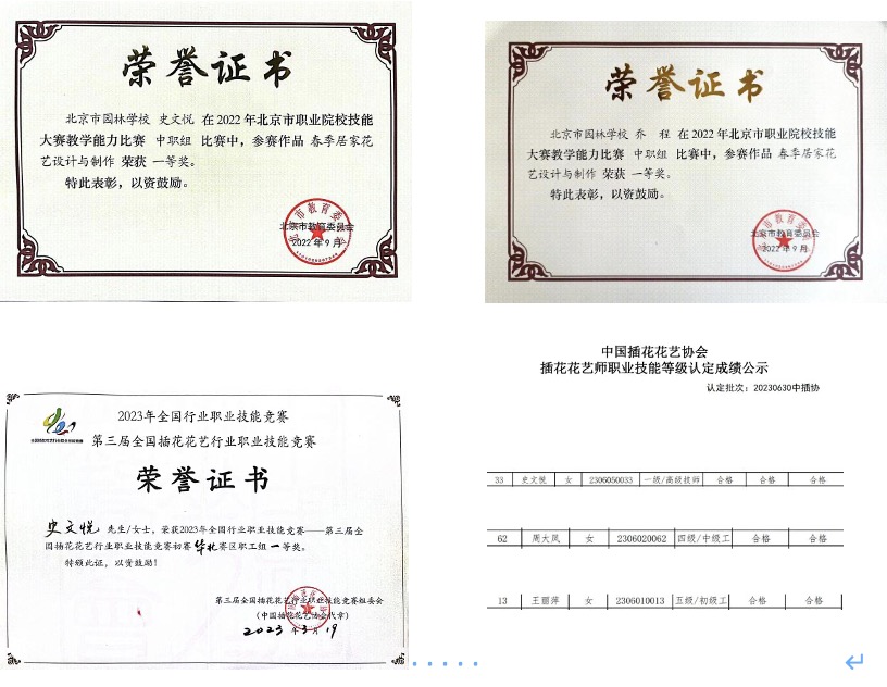 自建设期以来,以赛促教、以赛促学、以赛促建、以赛育人是学校教育理念的一大创新。学校和花艺大师都高度重视中职学生技术技能大赛,以课训赛中心为载体共同搭建“花艺项目技术技能选手平台”,不断提高学生竞赛水平和专业技能水平。在花艺大师和行业专家指导下,学生参加校级、市级、国家级和行业技能竞赛20余,获奖颇丰。2022年-2023年,荣获第三届全国插花花艺行业职业技能大赛(华北赛区)学生组三等奖1个、第47届世界花艺大赛(北京赛区)选拔赛一等奖1个、北京市职业院校技能大赛(花艺)赛项一等奖1个、三等奖2个,园艺赛项二等奖和三等奖各2个;首届郁金香插花花艺大赛金奖2个、银奖2个;北京市职业院校技能大赛植物嫁接一等奖和三等奖各1个,园林微景观设计与制作一等奖和二等奖各1个,植物病虫害防治一等奖和二等奖各1个;工程测量三等奖2个;获得全国职业院校中职组赛项二等奖1个、三等奖2个。