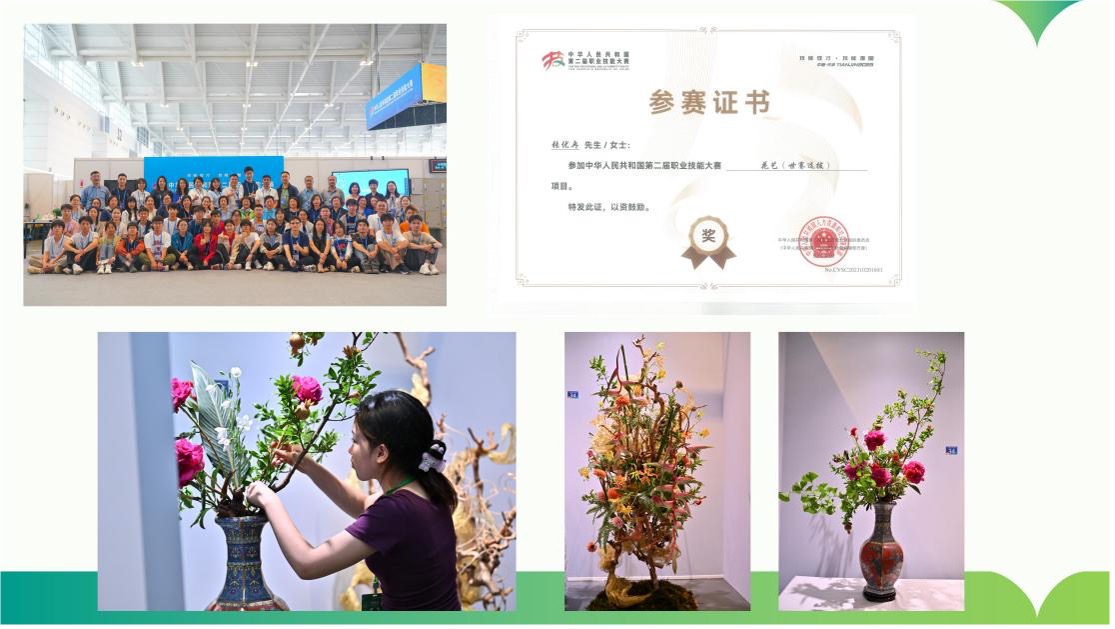 建设期内,我校花艺专业坚持以赛促教、以赛促学,构建“国家-行业-区域-学校”四级赛训体系,通过中华人民共和国职业技能大赛、全国职业院校技能大赛等国家级赛事锤炼技艺,依托林草技能大赛、北京职业院校技能大赛等省市级赛事夯实基础,亮相成都世园会等国际平台展现专业实力。学生们以花为媒,斩获多项国家级、省部级荣誉,培养出国家级插花花艺师高级技师(一级)1人、高级工3人、中级工38人、初级工34人,实现竞技场绽放芳华的育人蝶变。