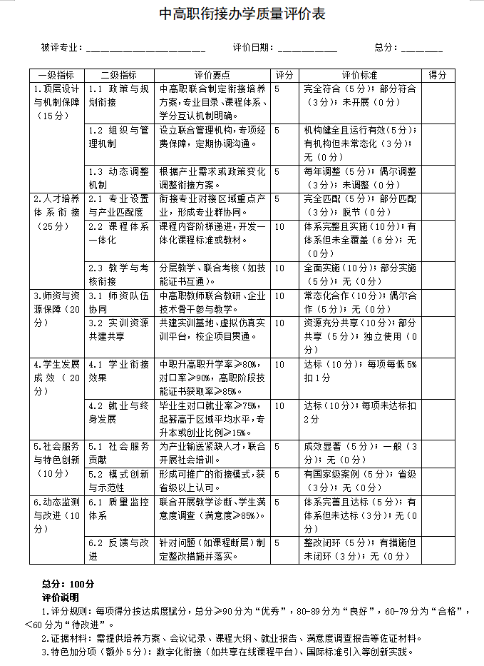 核心指标达标情况:中职升高职升学率、对口率均达 100%(“学业衔接效果” 获 10 分),高职阶段技能证书获取率 90%(超评价标准 5%)。