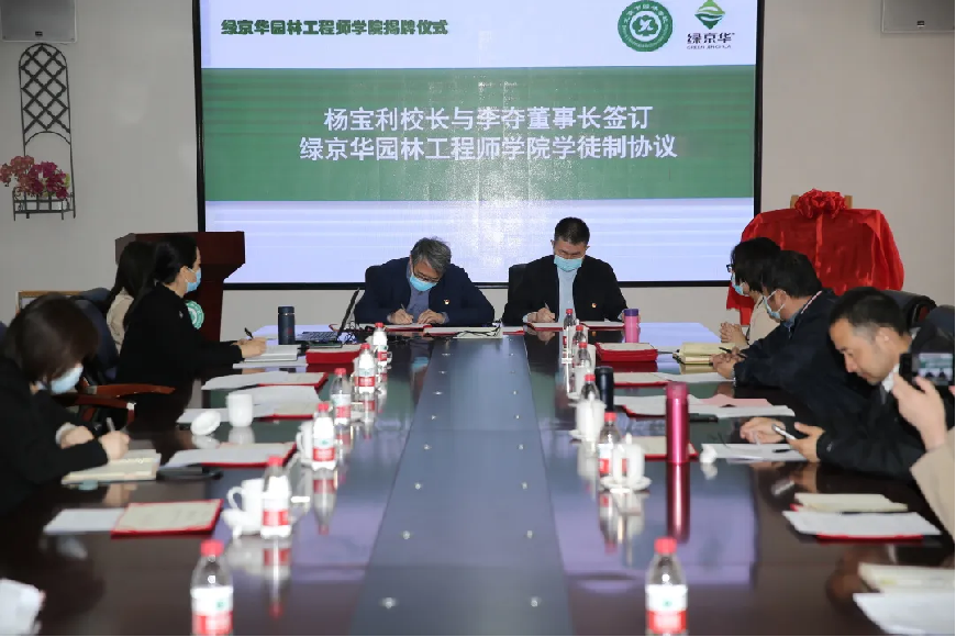 伴随着全场热烈的掌声,杨宝利校长与李夺董事长签订《绿京华园林工程师学院学徒制协议》,并为工程师学院揭牌。