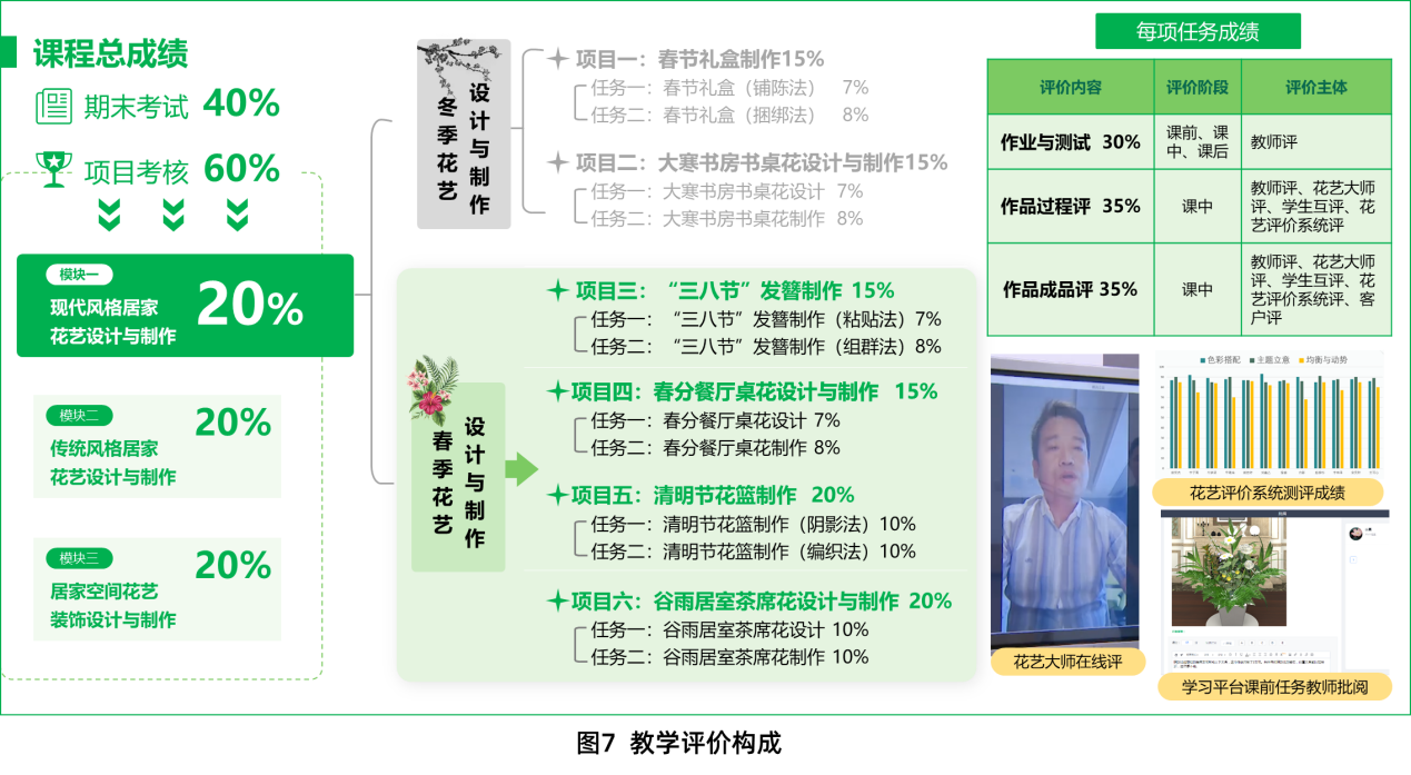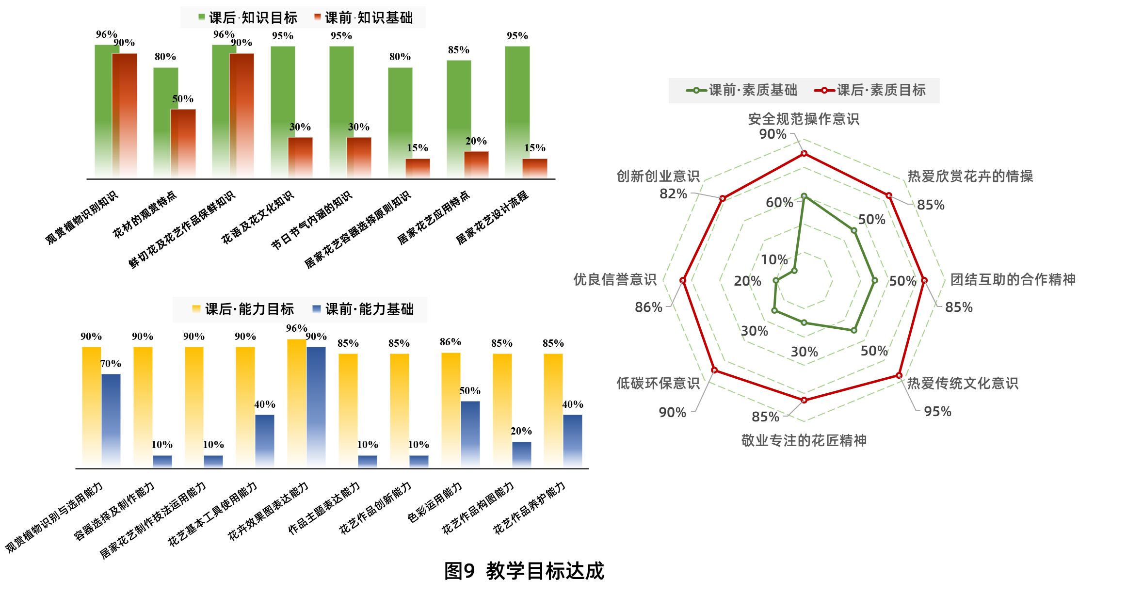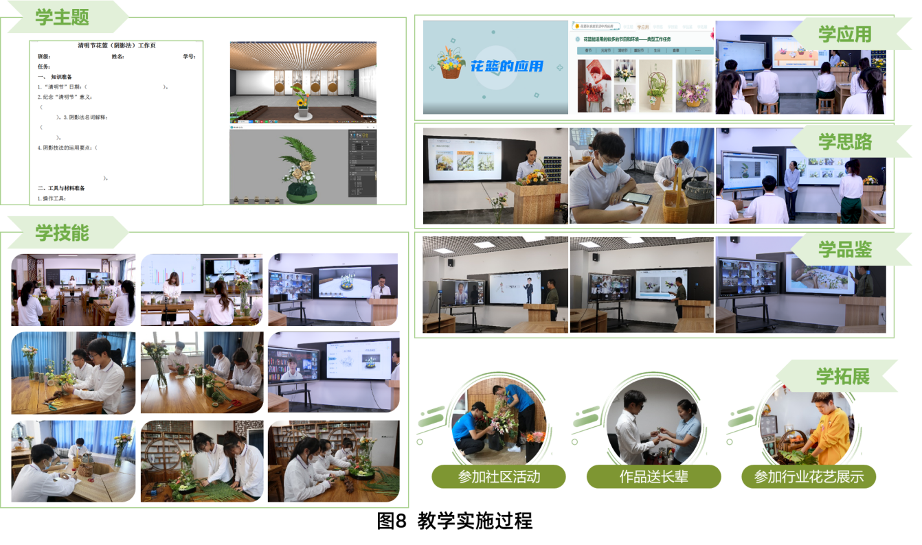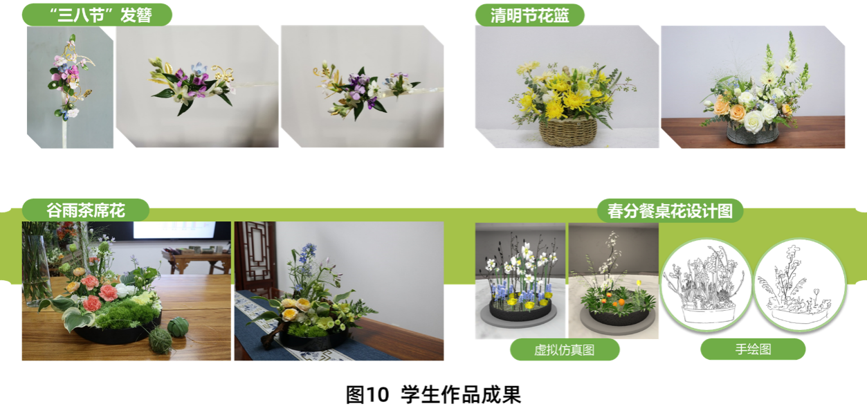 通过线上线下混合学习,依托大师工作室开展教学,校企融合资源共享,教师与花艺大师共同育人,圆满达成知识、能力和素质目标。