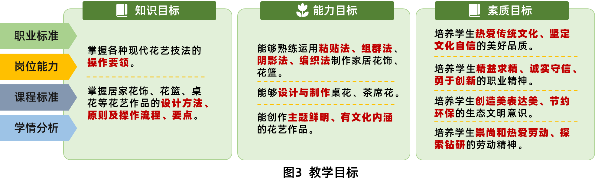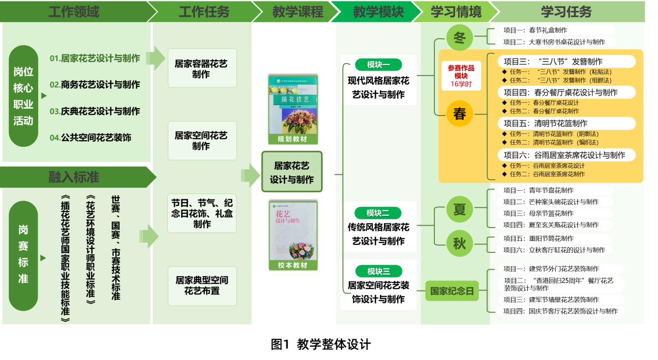 课程依据《插花花艺师国家职业技能标准》、《世界技能大赛花艺项目技术标准》和《中等职业学校花艺设计与制作专业教学标准》设计课程的教学内容。