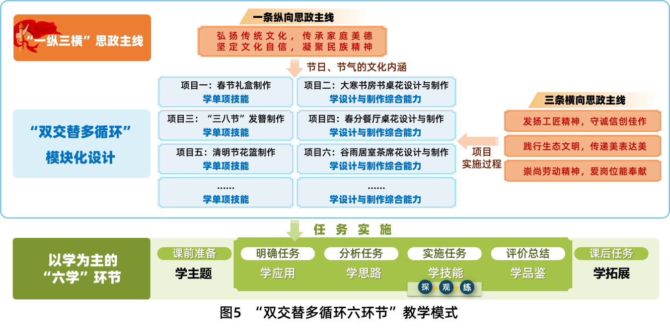 以真实花艺工作任务为载体,以“六学”环节即“学主题、学应用、学思路、学技能、学品鉴、学拓展”递进式的开展技术技能训练。
