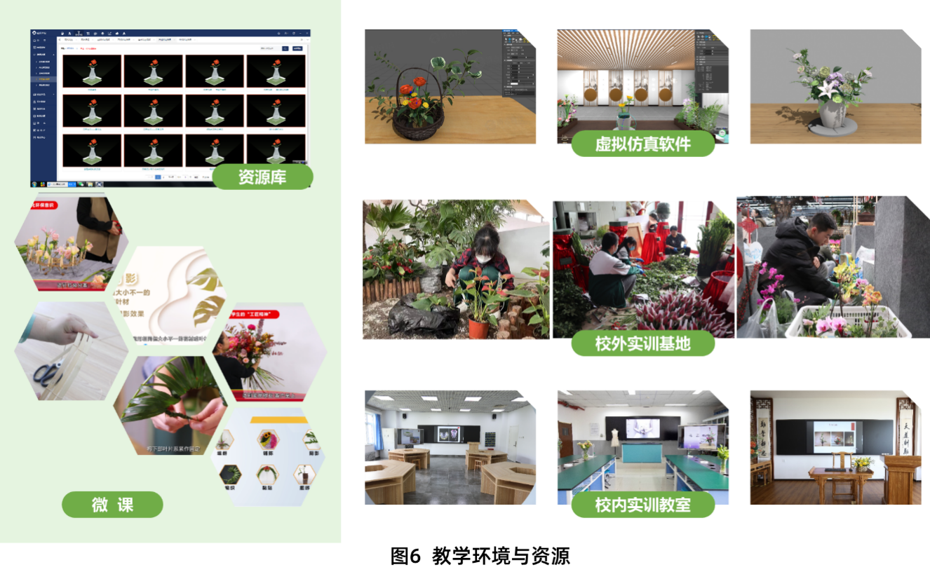 依托花艺大师工作室开展教学。校内理实一体化实训教体现行业文化;通过多屏在线直播,展示教师和花艺大师实操细节。借助作品案例库、花材数据资源库、微课视频库、题库及虚拟仿真软件等丰富多彩花艺教学资源平台开展教学。