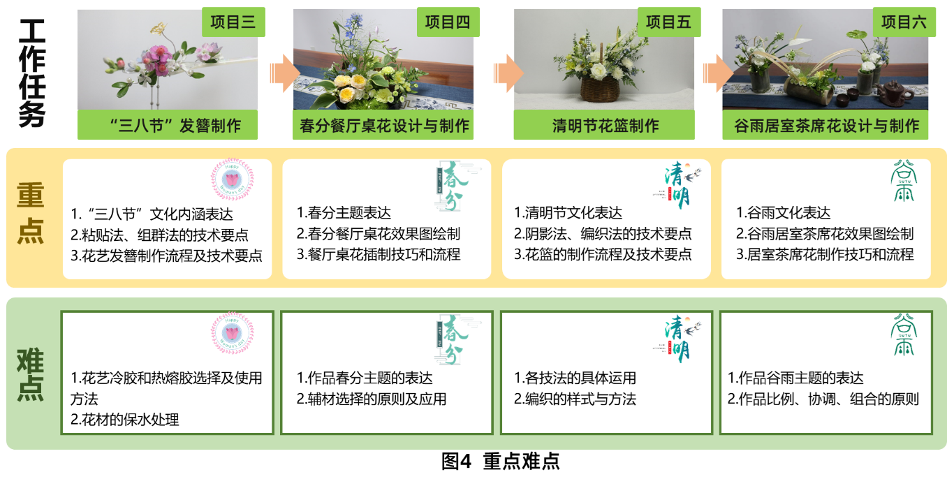 创新“双交替多循环”模块化设计:每个模块的项目一、项目三、项目五主要以节日、纪念日为创作主题,培养学生的花艺制作手法与技巧,练就岗位基础能力;每个模块的项目二、项目四、项目六主要以节气为创作主题,培养学生花艺设计与制作技能的综合能力,练就岗位适应能力。