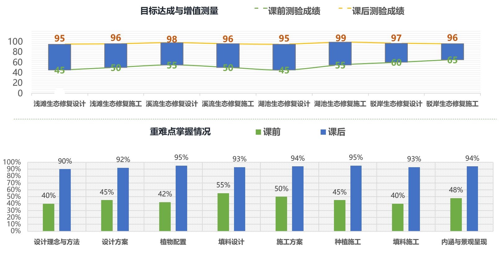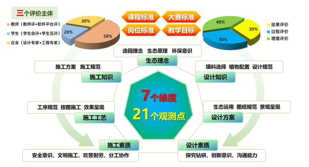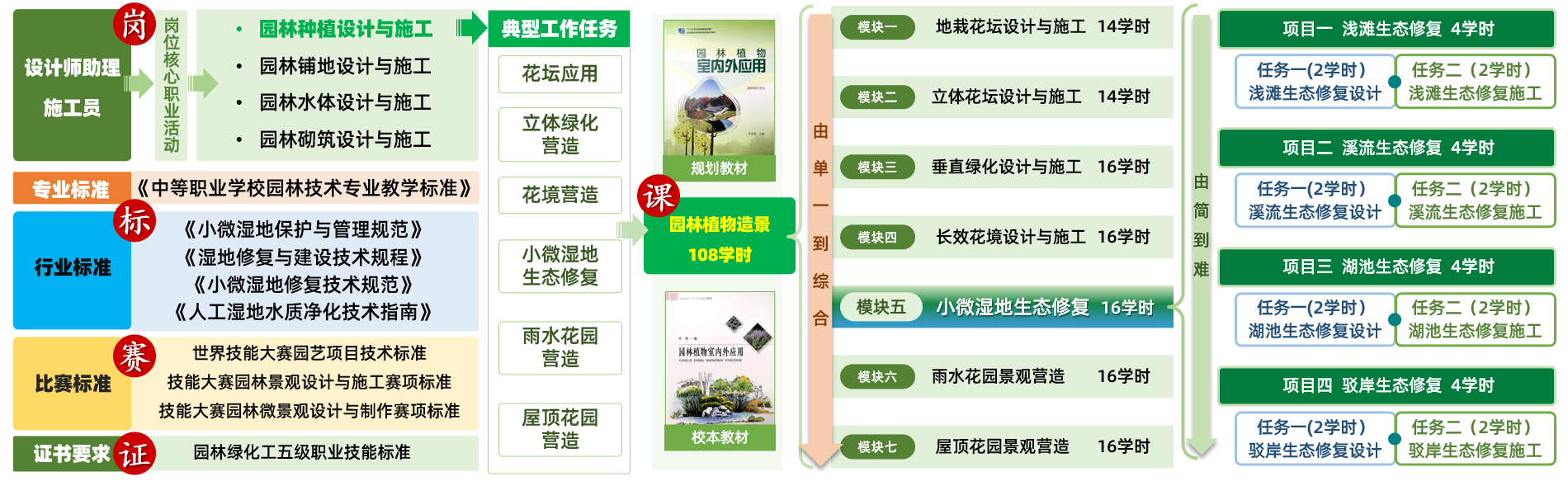 依据国家职业技能标准、园林设计师助理与施工员岗位标准、园林景观设计与施工赛项要求,重构教学内容。课程全过程贯穿能设计会施工、营造长效生态景观的育人理念。
