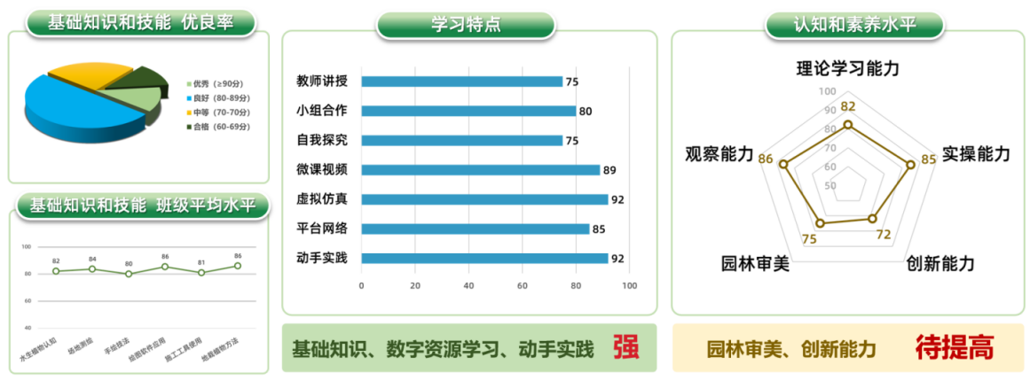 通过线上线下混合学习,依托园林工程师学院校企融合资源,各项目从知识、技能、素养三方面考查均达优良成绩,教学目标达成,学生修德强技,加强了生态造园、园林审美和创新能力。
