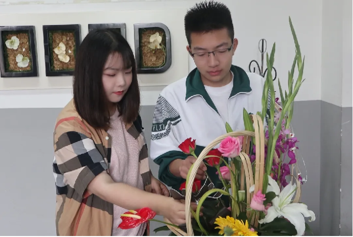 此次比赛难度可谓历年比赛中难度最高的一次,但师生们迎难而上,刻苦训练,将比赛作为一次系统学习和提高的机会。在备赛阶段,指导教师与学生一起认真研究历年获奖作品,分析每个作品的优点与不足,搜集大量礼仪插花相关资料,认真学习,并将学校以往参赛作品逐个剖析。在设计作品的阶段,克服花材、花泥、包装纸不够的问题,通过一次又一次的修改,最终设计出参赛作品。