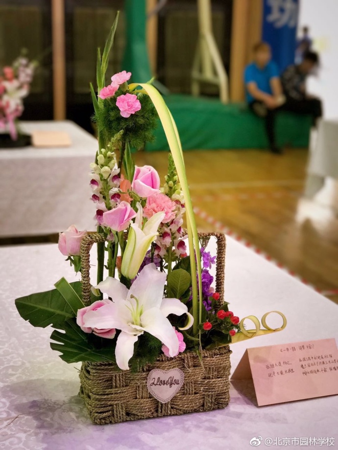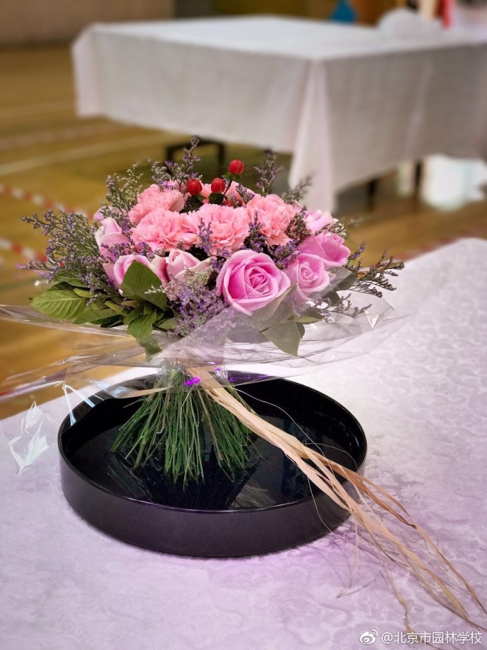礼仪插花比赛中,神秘箱中多姿多彩的鲜花在选手们灵巧的双手下,变成一个个匠心独具的精美花篮与风格各异的礼仪花束。