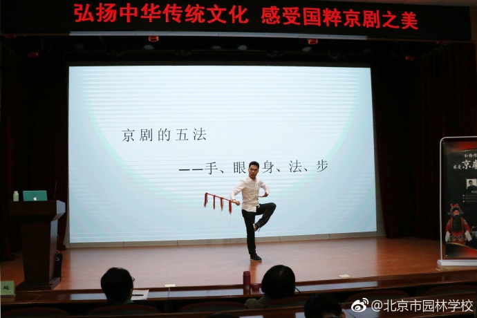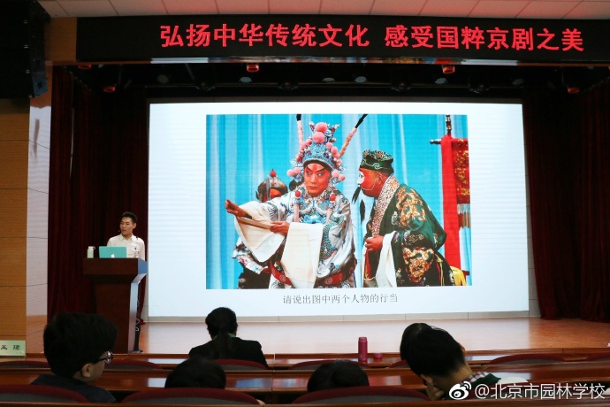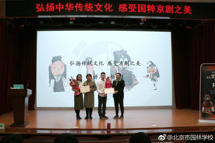 近日,园林学校举办“弘扬传统文化 感受京剧之美”主题讲座暨京剧兴趣小组启动仪式。学校邀请国家京剧院演员、谭派第七代传人、戏娃艺术团团长杨超来校进行“弘扬传统文化 感受京剧之美”主题讲座,并与学生互动交流。学校曲艺社成员向专家及全体师生展示京剧“淮河营”“定军山”片段,学校向杨超颁发艺术顾问聘书。本次活动旨在打造校园文化特色,弘扬传统文化,促进非物质文化遗产的传承与发展。