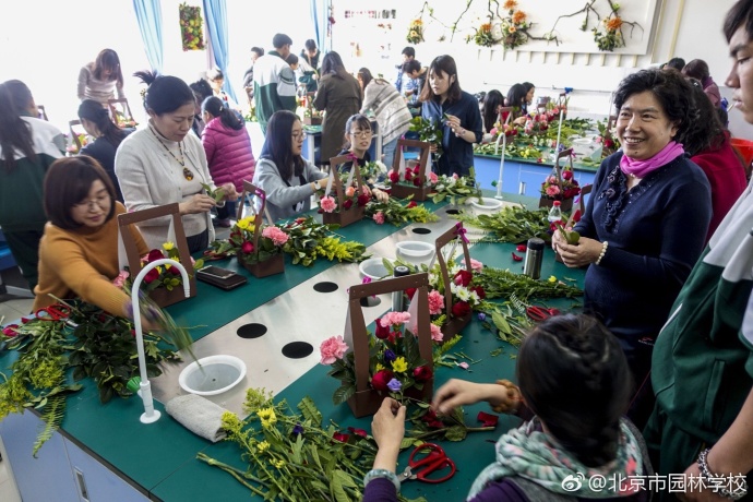 园林学校发挥资源优势,对公众开展“花样年华  芬芳之旅”花艺体验活动。大家艺于花室,手眼心法溶于一处,多彩花篮带来春的祝福。