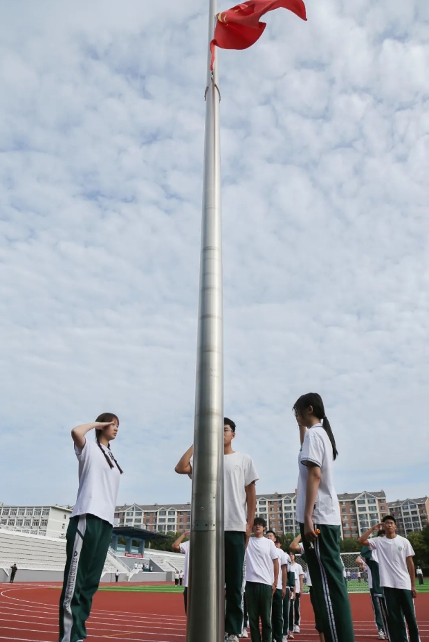 迎着朝阳,国旗班队员迈着整齐的步伐走向升旗台。雄壮的国歌声中,鲜艳的五星红旗冉冉升起。全体师生肃立注目,表达对祖国的热爱和敬意,心中充满对新学期的期待和憧憬。