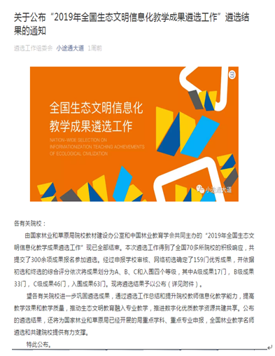 近日,由国家林业和草原局人事司指导,国家林业和草原局院校教材建设办公室和中国林业教育学会共同主办的“2019年全国生态文明信息化教学成果遴选”工作全部结束,并公布了遴选结果。园林学校史文悦老师的《插花与花艺制作》课程被评定为职业教育组B等级。