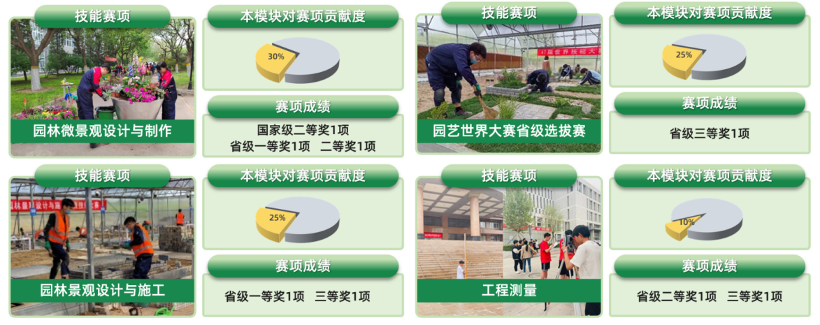 基于生态理念的造景能力提升,植物栽植、置石施工、填料施工等技术更加娴熟,创新思维得到充分锻炼,感受美发现美创造美的能力大大提高,夯实了职业核心能力。在国家级、省级技能比赛中,分别获得国家级二等奖1项,省级一、二、三等奖各2项。