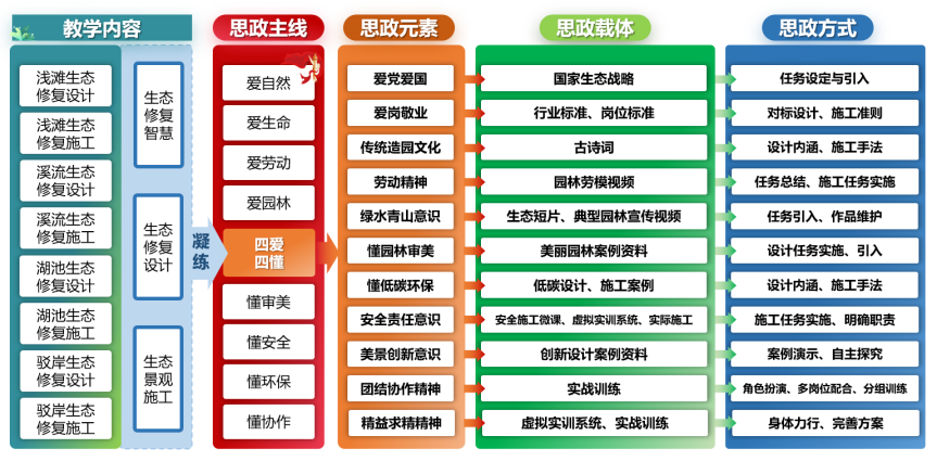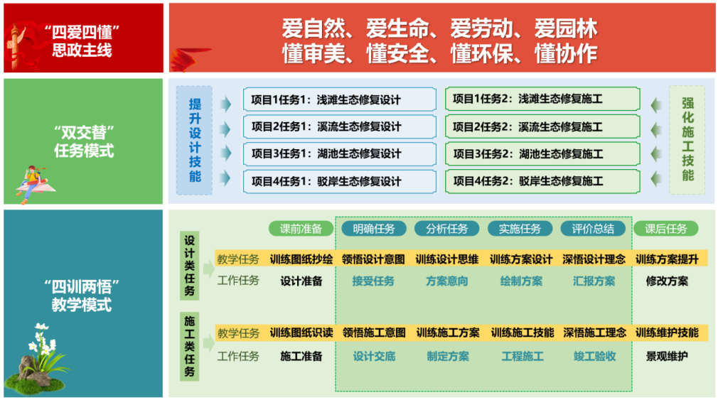 将“爱自然、爱生命、爱劳动、爱园林;懂审美、懂安全、懂环保、懂协作”全过程融入双能力培育,强化学生民族文化自信与保护修复生态环境、传播环保理念的使命担当。