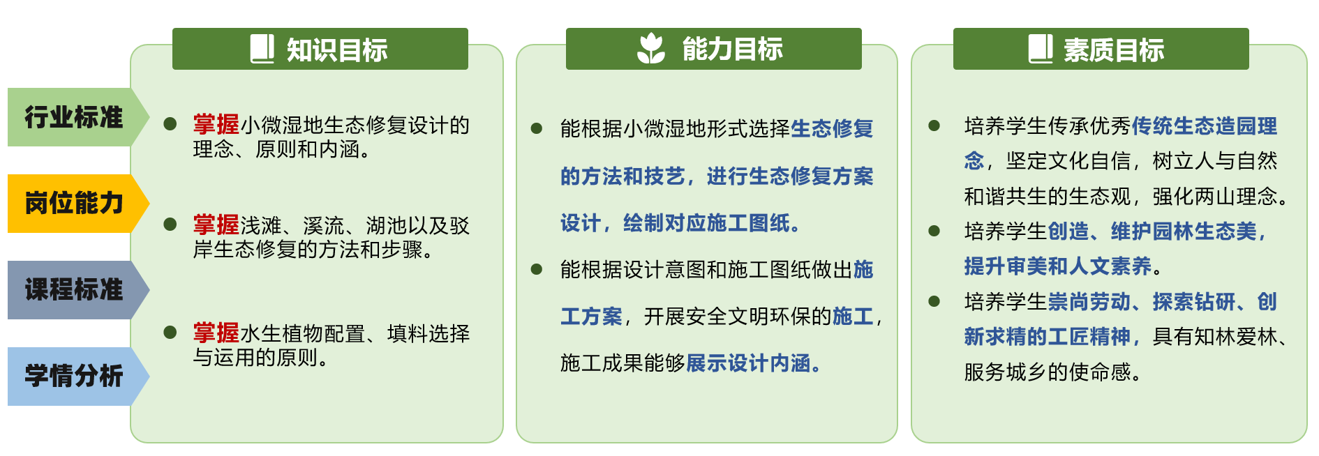 依据国家标准、地方标准和课程标准等,在全面分析学情的前提下,确定教学目标,其中重点为生态填料设计、设计方案绘制、施工方案设计;难点为水生植物配置、生态修复技术、景观内涵呈现。